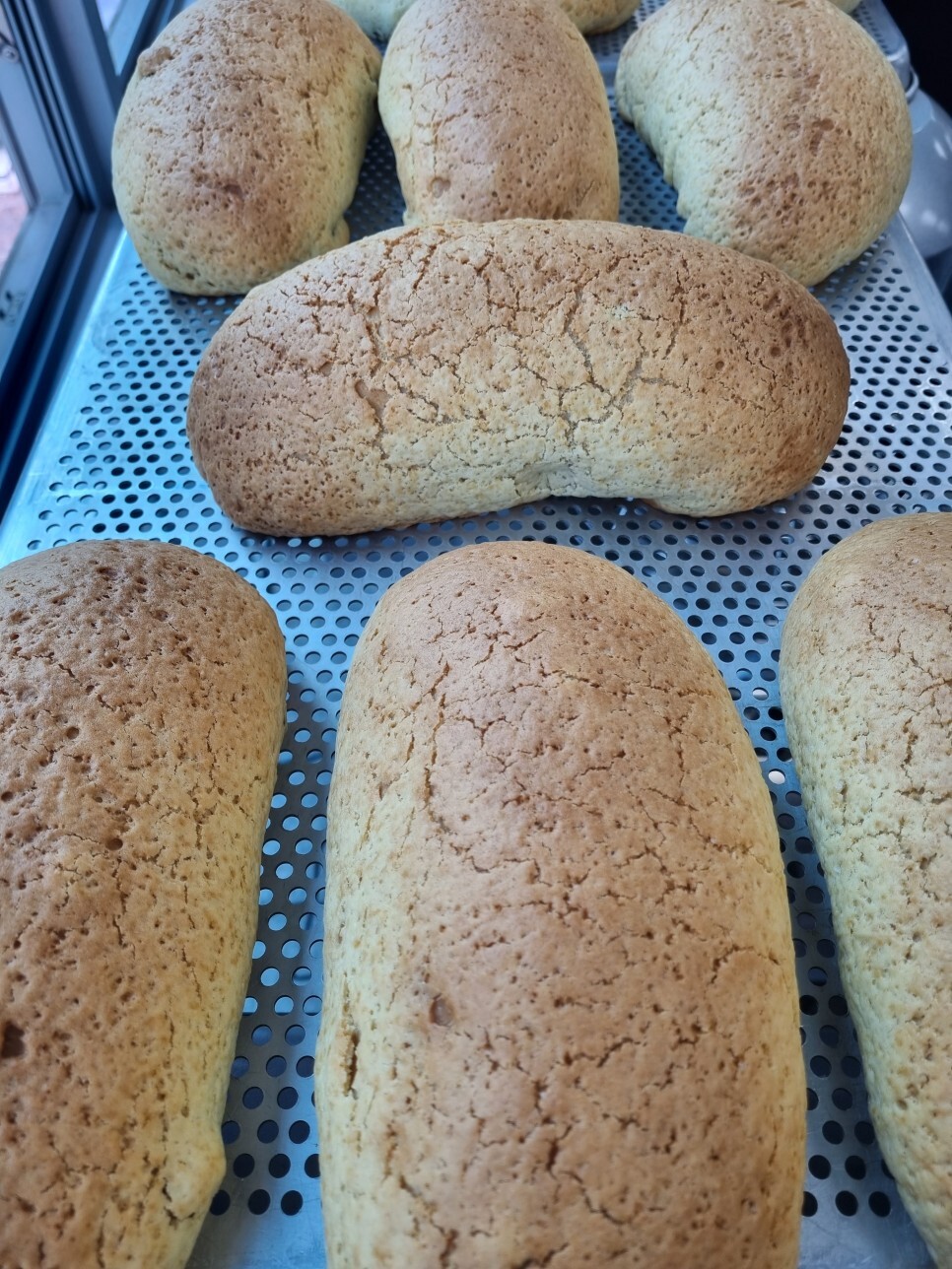 - 1차 발효(토핑 준비) → 분할, 둥글리기 (반죽 250g, 토핑 100g) → 중간 발효 → 성형(타원형) → 2차 발효